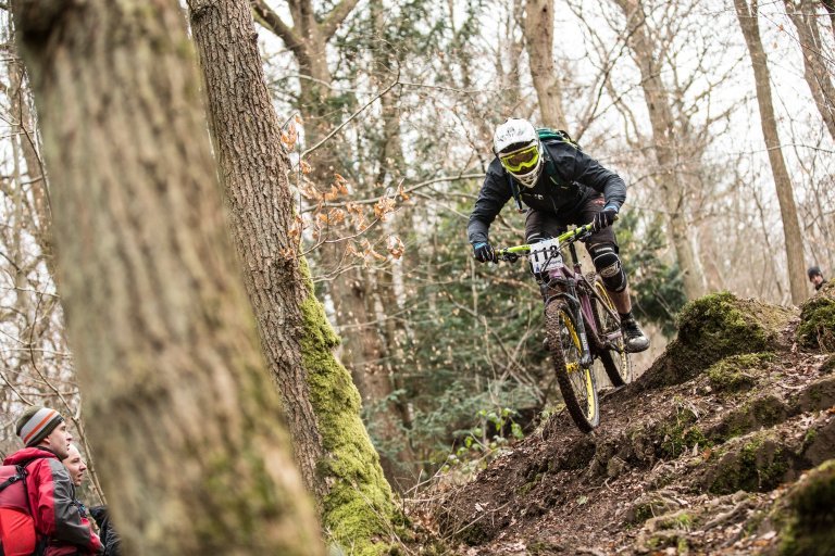 Dann ging es für alle nach und nach auf die erste Stage. Diese begann mit einem langen Tretstück mit wechselnden, weiten Rechts-Links_Kurven, darauf folgte eine Kompression auf einen Forstweg, die schon unerwartet stauchte und die Gabel eintauchen ließ. Weiter schlängelte sich der Trail über eine recht enge Brücke mit einem sehr unflowigen, engen Ende. Darauf folgte ein kurzer Uphill mit einem schnelleren Bergab-Stück, in dem es eine Abkürzung gab, die einige von uns, auch beim zweiten Mal, einfach nicht sehen wollten. Und da war er plötzlich, der Uphill. Fitte konnten ihn fahren, weniger Fitte schieben und rennen oder für den Rest hieß es einfach nur hochkommen. Oben angekommen und mit einem gefühlten Puls von 200 dezent aufs Bike geschwungen und einem flachen Trail folgend zum finalen Abwärts-Segment getreten. Dieses war mit engen Kurven gespickt, die an zwei Stellen abgekürzt werden konnten. Unten noch einmal ein Bachbett gekreuzt, Füße genässt und dann war die erste Stage gemeistert. Sichtlich aus der Puste sammelten wir uns kurz, um wieder hoch zur zweiten Stage zu treten.