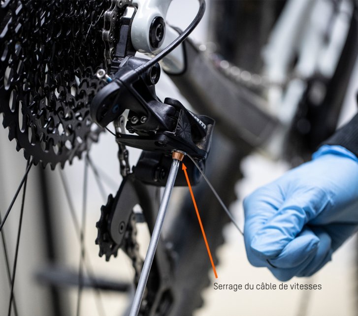 Lorsque tu serres la vis, tu devrais tirer un peu sur le câble de vitesses pour créer la tension nécessaire. © bc GmbH