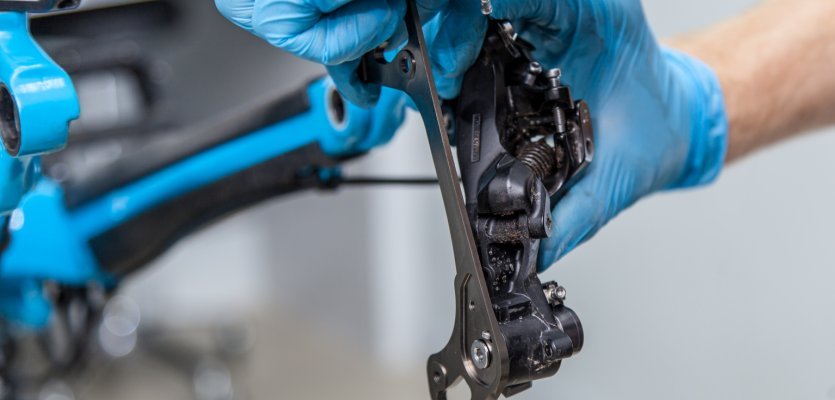 - Um das Schaltwerk zu entspannen, drückst Du das Schaltwerk in die oberste Endposition, Richtung Rahmenmitte und hältst es mit einer Hand fest.