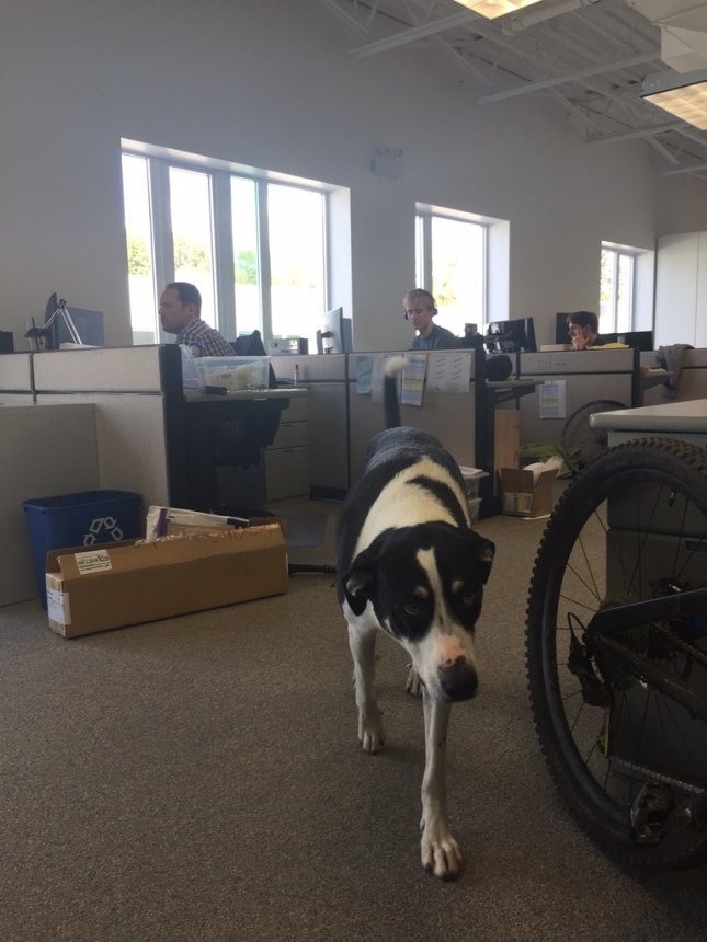 Bei Race Face ist man, wie bei Chromag, auch auf den Hund gekommen: James ist ein Teil von Race Face wie jeder andere Mitarbeiter. Er läuft frei herum und kümmert sich um eine positive Arbeitsatmosphäre.