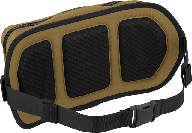 The Hip Bag from Capsuled offers an impressive four litres of storage space for food, tools, drinks and more. The three ergonomic premium pads and adjustable hip belt make the bag extremely comfortable to carry. The layout is impressive: the main compartment is complemented by two inner compartments, an inner zip pocket and another inner mesh pocket, which helps you keep everything perfectly organised. The contents of the bag are optimally protected by a waterproof zipper and water-repellent, robust material. On the outside, there are two expandable mesh pockets where you can quickly access a drink bottle or energy bar, for example. The bright saffron yellow interior makes the contents particularly easy to distinguish from each other. A central reflective stripe increases your visibility under direct light shining upon it, but otherwise blends in with the main fabric.