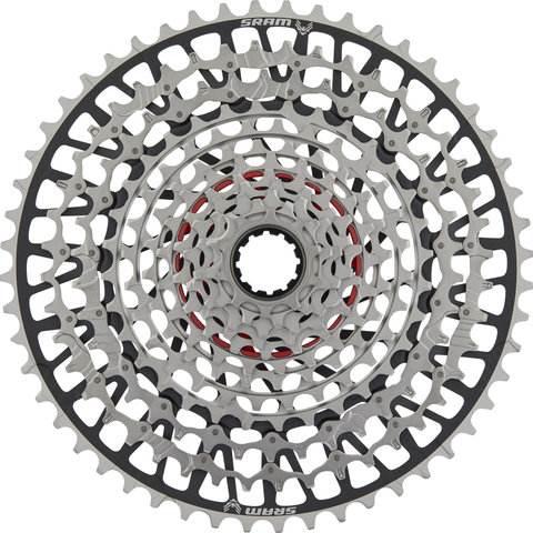 La cassette XS-1297 est dotée d'un pignon en aluminium et de onze pignons en acier. Elle a une large gamme de 10 à 52 dents, dont les sauts de vitesse ont été optimisés par rapport aux cassettes Eagle. La conception X-SYNC permet des performances de changement de vitesse exceptionnelles, même et surtout à pleine charge. Grâce au « mapping » des cassettes, les changements de vitesse se font le long de rampes de changement de vitesse prévues à cet effet, ce qui rend le processus extrêmement fluide. Le pédalier est léger et rigide grâce aux bras en carbone avec un noyau en mousse et est combiné avec un plateau Direct-Mount de 32 dents. Celui-ci, tout comme les pignons de cassette et les galets de dérailleur, a été parfaitement adapté aux chaînes T-Type. La chaîne XX a un design Flattop particulier qui rappelle les chaînes de route, mais qui a été spécialement conçu pour Eagle Transmission. Elle est particulièrement durable et dotée d'une finition hard chrome et de broches creuses permettant de réduire le poids.